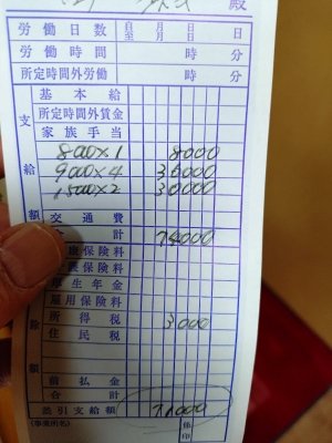 今日のお給料は、指名50分コ-ス1本8000円、割引あり、指名50分コ-ス4本36000円、指名50分コ-ス全額バック30000円、ト-タル74000円の雑費3000円引きの、手取り71000円です。7時間勤務、このかたは指名の多いいキャストさんなんで、毎日これぐらいの給料です。