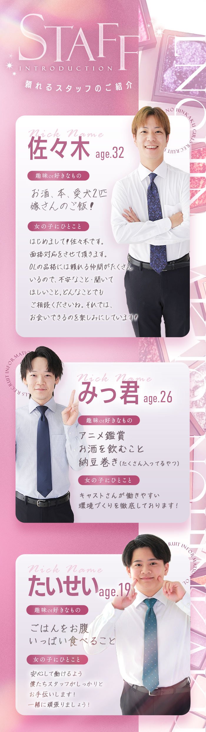 ※特別指名料1,000円~10,000円上乗せ ※オプションバック500円~2,000円×個数上乗せ ※1日500円引きのみ ※指名の給料となります ※保証制度あり 給与シミュレーションはこちら |