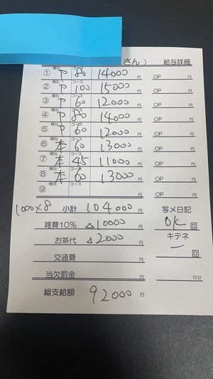 10/28 お給料【92,000円】8時から18時あがりのhちゃん