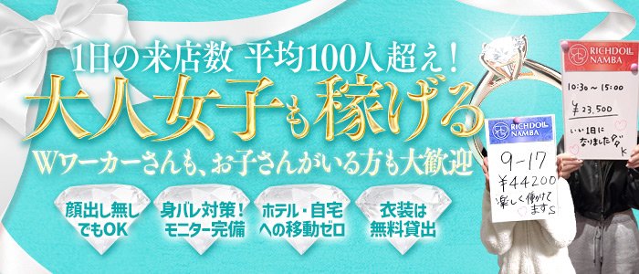 ◇◇時間効率が良い◇◇ 徒歩で移動や車で移動する時間はお金を生まない無駄な時間となっちゃいます。 少ない時間の勤務ならお仕事につける数が少なくなっちゃいます。 長時間勤務でたくさんお仕事につく場合には、ロスが積み重なってとんでもなく無駄な時間が増えていきます。 1日ならまだしも...1ヶ月、3ヶ月、半年、一年と 無駄な時間は膨大に膨れ上がっていくばかりなのです。 リッチドール難波は、すべて店舗内でのお仕事になりますので移動時間は“0”です。 少ない時間でも時間効率よくお仕事につくことができます(^^) 長時間勤務なら...先ほどの説明の逆になります(^^) つまり、短時間でも長時間でも移動時間という無駄な時間はない方が良い! という事になります(^^) 【リッチドールなんばは待遇も充実!!】 ■見学のみOK ■体験入店OK ■面接交通費支給 ■友達と面接可 ■自由出勤 ■週1~2日 ■短期OK ■入店祝い金あり ■完全日払い ■指名料バック ■オプションバックあり ■送りあり その他etc… まずはお気軽にお問い合わせください!! |