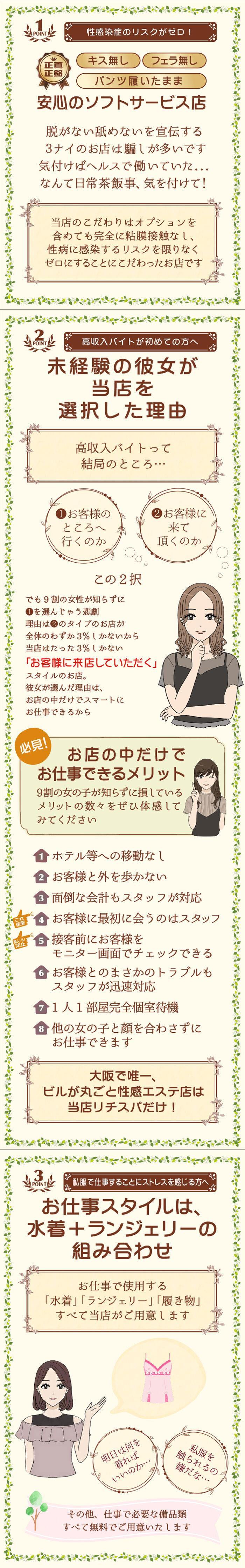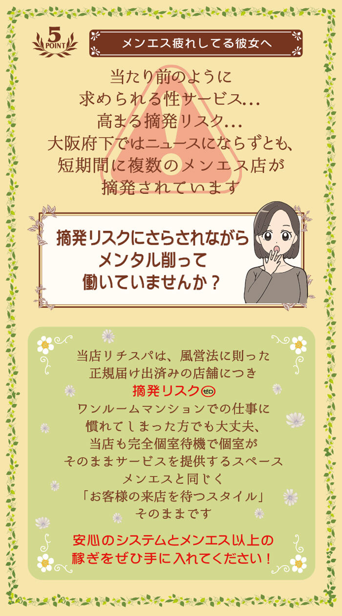 A【リチスパ】は、お店の中だけでお仕事できる大阪唯一のビル一棟店舗型性感エステとなります!