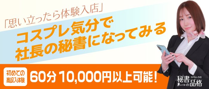 コスプレ気分で社長秘書、お店の中だけでスマートにお仕事しませんか?店舗内で制服の秘書スーツを身にまとい、社長様(お客様)を癒しておもてなしする簡単なお仕事内容です。高収入バイト、風俗のお仕事が初めての未経験の方にピッタリの環境ですよ!安心安全に安定した収入を得ることができます。お気軽にお問い合わせ下さい!
