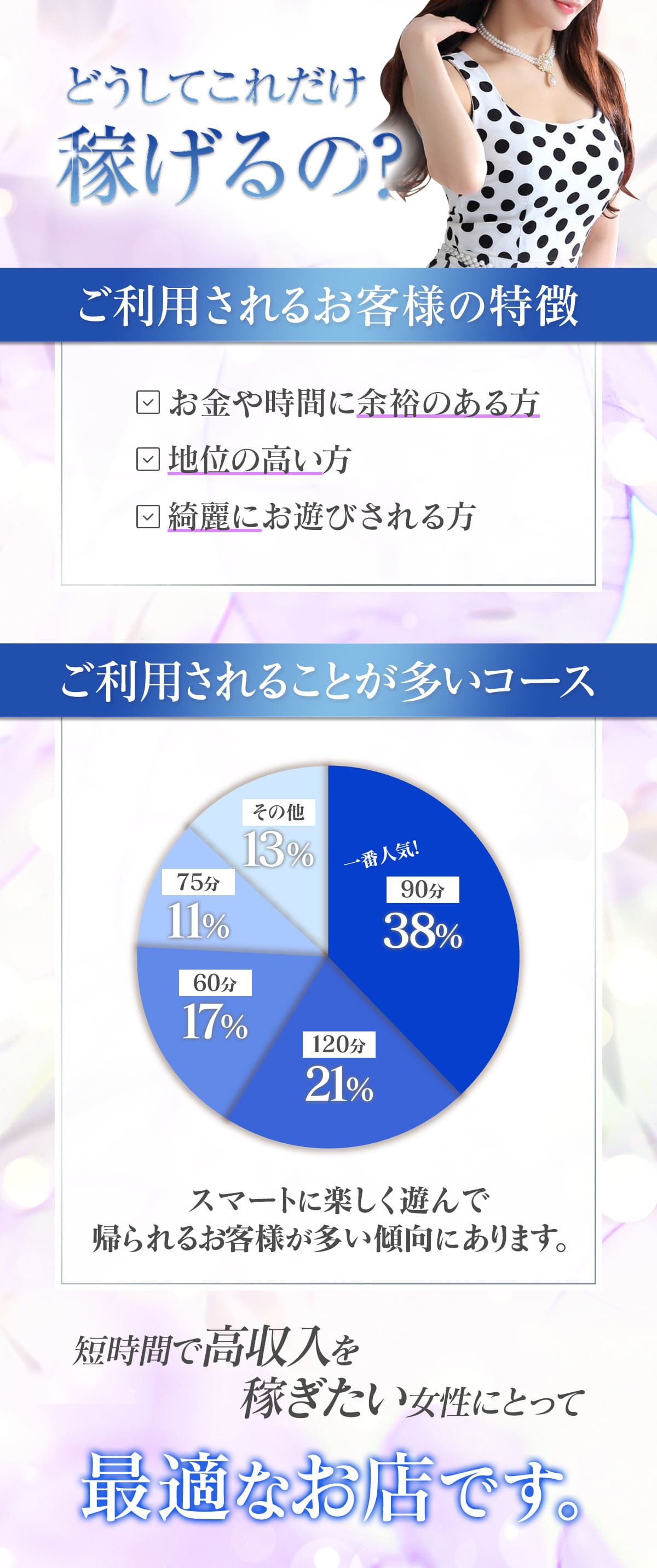 1日2~3時間の勤務でもちゃんと稼いで頂ける自信がありますので、アナタの稼ぎたい金額にあわせて出勤時間も決めて頂けます!