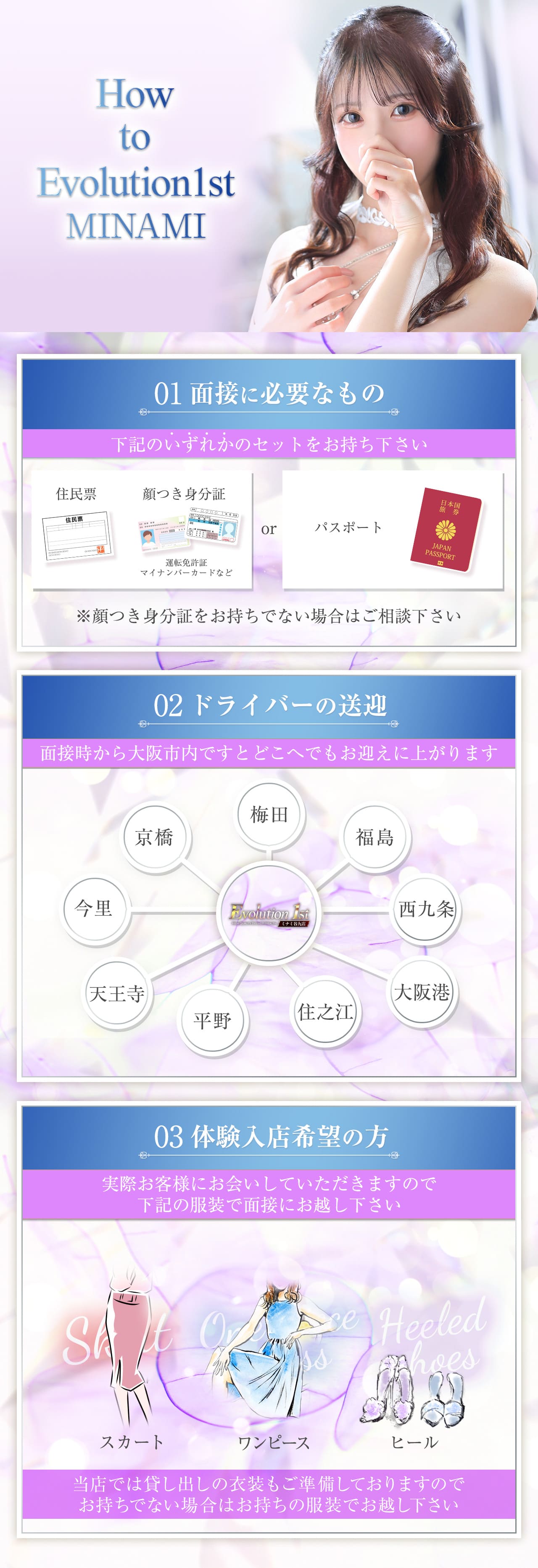 | A | 面接にお越しいただく場合は 「顔写真付き身分証」+「本籍地入りの住民票」or「有効期限内のパスポート」 が必要となりますm(_ _)m 顔付き身分証がない場合はお気軽にご相談くださいませ(*^^*) 面接日にそのままお仕事をご希望される場合は 【スカートかワンピース】 お履物は【スニーカー以外】の格好で お客様へお会いしていただいておりますのと 下着に関してお持ちであれば【Tバック】の着用 お持ちでない場合は【上下セットの下着】でお願いいたします。 |