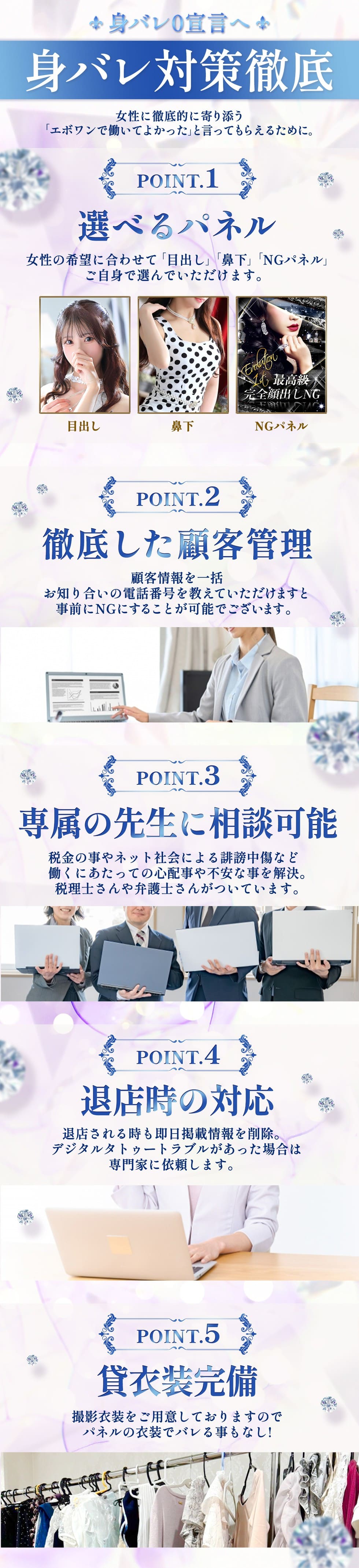 | A | 大変申し訳ございませんが、他店様との掛け持ち勤務を基本的にNGとさせて頂いております。 これはお店同士のトラブルを避けるというのもありますが、働く皆様の価値を下げないようにという配慮でもあります。 どうしても掛け持ちでなければならない理由などございましたら、面接時に相談を受付けておりますので今の現状などをお気軽に面接官へとご相談下さいませ。 また、面接段階では他店様をお辞めになられてからでないと面接が受けれないと言う訳ではありません。 他店様に在籍があっても話をまず聞いていただいてからどうするかご検討を頂ければ幸いです。 |