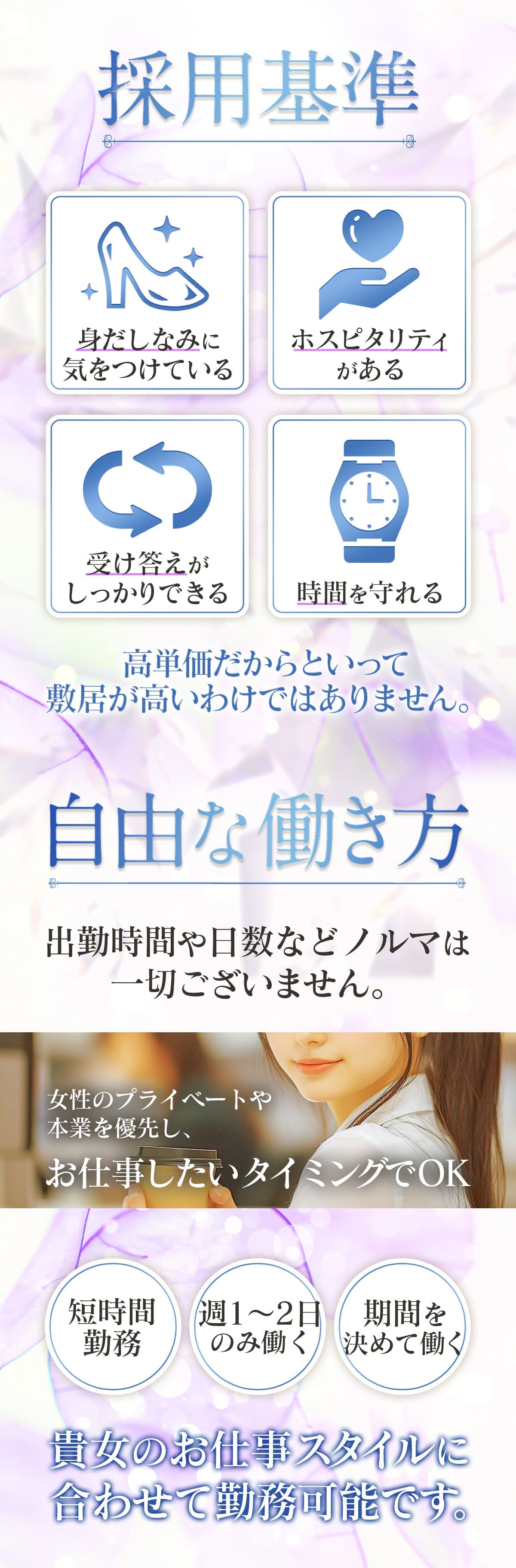 | A | スタイルというと容姿・体型などが一括りにて思い浮かばれますが、容姿や体型だけで採用を決めているわけではありません! 【清潔感】は重要視させて頂いております。 採用=スタイル重視ではないのでその辺りはご安心下さいませ! |