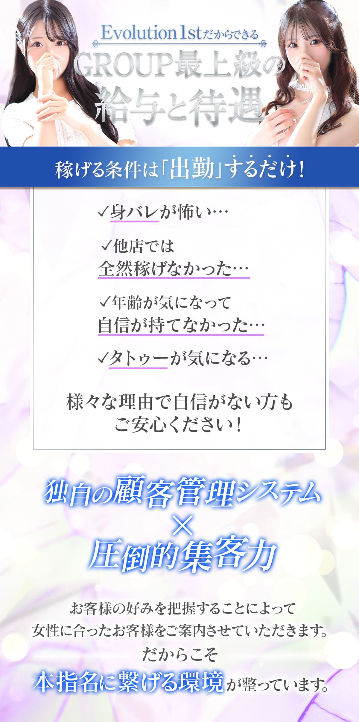 | A | 大丈夫です! このお仕事を始める時は誰もが最初は全員「初めて」です! 経験者の方でないと採用されなさそうと業界では思われているみたいですがそんな事は一切ありません! 未経験女性でも【ちゃんと働けて】【ちゃんと稼げる】ようにスタッフ全員で協力体制を取っておりますので「最初の一歩」をEvolution 1stミナミでぜひ、サポートさせて下さいませ! |
