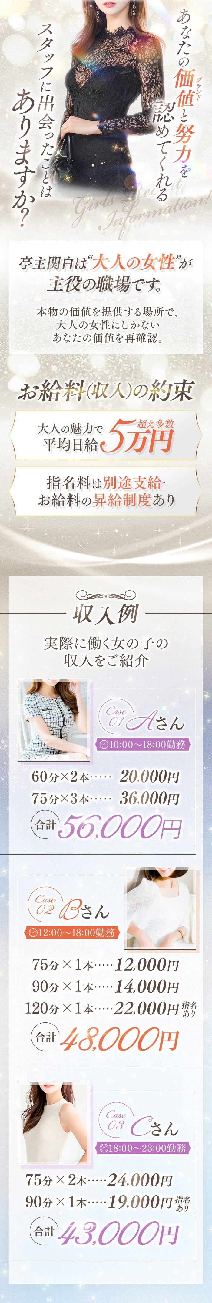 初めてのお店やお仕事に不安を感じる方、 「人間関係が心配」「続けられるか不安」という方も多いと思います。 『亭主関白 日本橋店』は、そんな女性の気持ちに寄り添うお店です。 在籍しているのは、家庭や昼職と両立しながら働く落ち着いた女性が中心。 派閥やギスギスした空気は一切なく、 お互いを気遣いながら働ける、穏やかな雰囲気が特徴です。 担当スタッフが一人ひとりにつき、 お仕事の流れ・お客様対応・シフトの相談まで丁寧にサポート。 困ったときや悩んだときには、すぐに話せる体制を整えています。 安心して続けられることを何より大切にしている それが、亭主関白というお店です。 まずはお気軽にご応募ください。 |