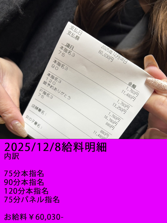 12:00-20:30の出勤で60,030円を受け取られました✨