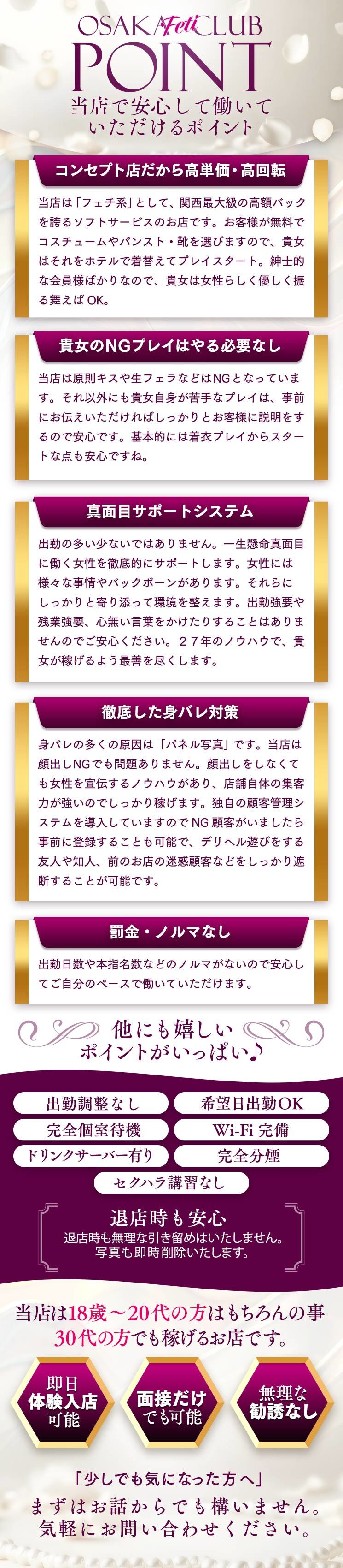 1本単価は入店すぐでも1万円以上のお店で、ソフトサービス店(オナクラ・エステ・M性感・マッサージ)だけでは無く他のヘルス(ホテヘル・デリヘル)やソープ等に比べても圧倒的な高収入・高額バックがフェチクラブなら可能なんです!