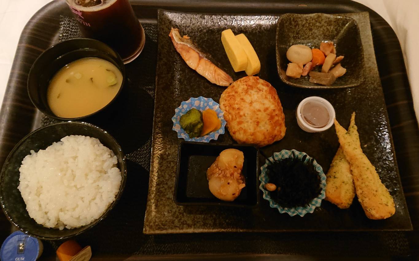 豆腐ハンバーグ、鮭、ちくわの磯辺揚げ、ひじき、玉子焼きetc.