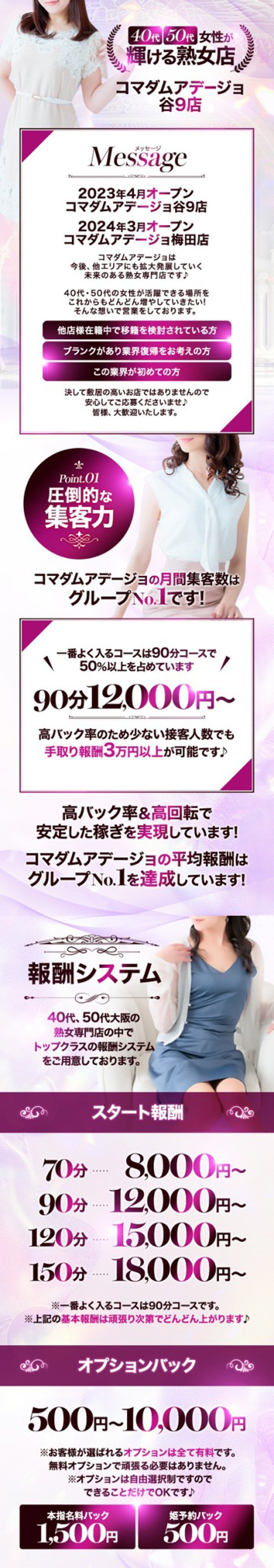 〜コマダムアデージョ谷9店の強み〜 ✅40代・50代の同年代のためのお店 ・実年齢だからこその魅力を引き出します✨ ・若いキャスト、歳が離れたキャストはいません ・気兼ねなく、居心地よく勤務していただけます ✅『人妻・熟女』カテゴリートップクラスの報酬額を設定しています ・メインコースの90分は、12,000円以上のバック💰 ・1日の平均報酬30,000円オーバー ・平均報酬額「グループNo.1」を達成しました❗️ ✅女性が接客しやすい顧客層&顧客管理システム ・50代・60代のお客様がメインの顧客層です ・顧客様はマイページで管理可能(メモ機能など便利な機能満載) ・グループの顧客管理システムを構築 ・当グループは年間2億円以上の広告費をかけており、そのうちコマダムアデージョだけでも2,000万円以上の広告費をかけて、お店の宣伝を続けております! ✅アリバイ対策を徹底しています ・ALL個室待機、セルフスペース ・会員管理で事前NGが可能 ・ホテルロビー待ち合わせ&ホテルロビー解散だからお客様と一緒に道を歩きません ・自社ビルに待機室を完備しているので、一般の方に会いません |