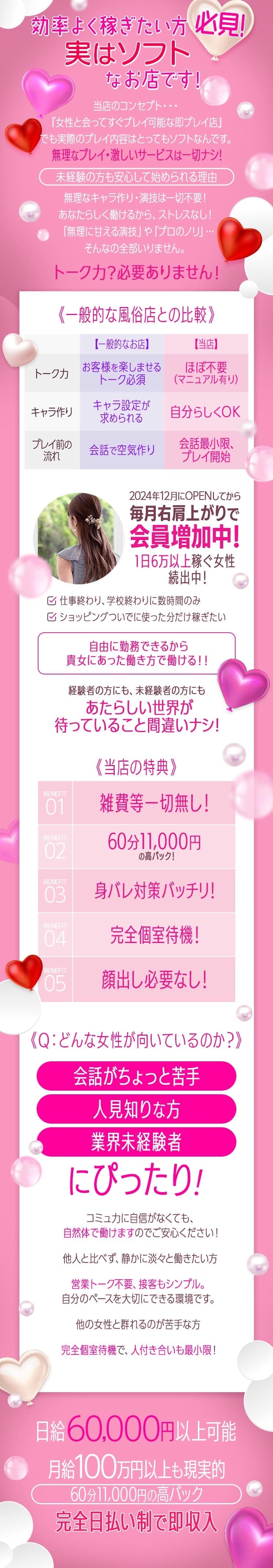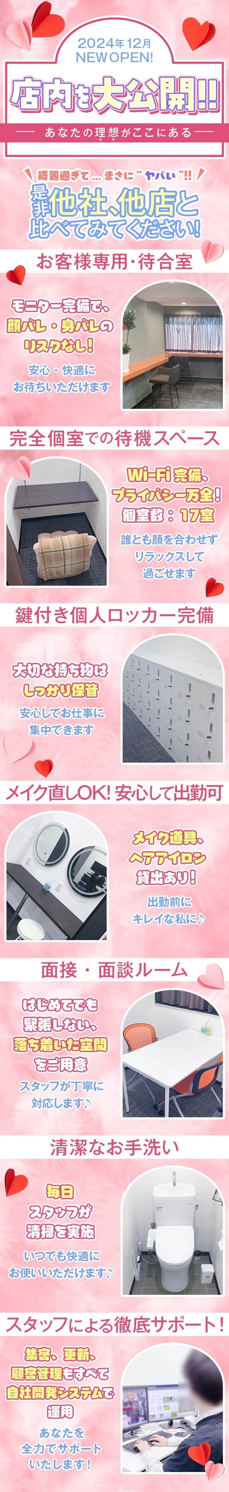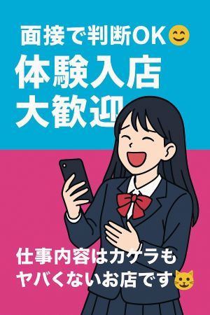 | A | 採用後、即日体験入店も可能となっております! お給料は完全日払いとなりますので、ご安心下さい♪ |