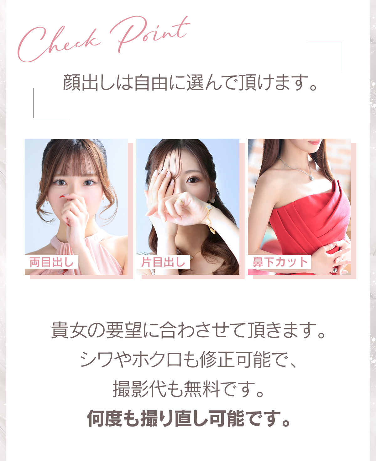 | A | もちろん大丈夫です! このお仕事を始める時、誰もが最初は「初めて」を経験します(*^^*) 経験者の方でないと採用されなさそう…と業界では思われているみたいですが、そんな事は一切ありません!🌈 未経験のキャスト様でも【ちゃんと稼げて】【安心してお仕事出来る】 この環境作りをスタッフ全員で心がけておりますm(_ _)m この業界での「最初の一歩」を是非サポートいたします(*^^*) |