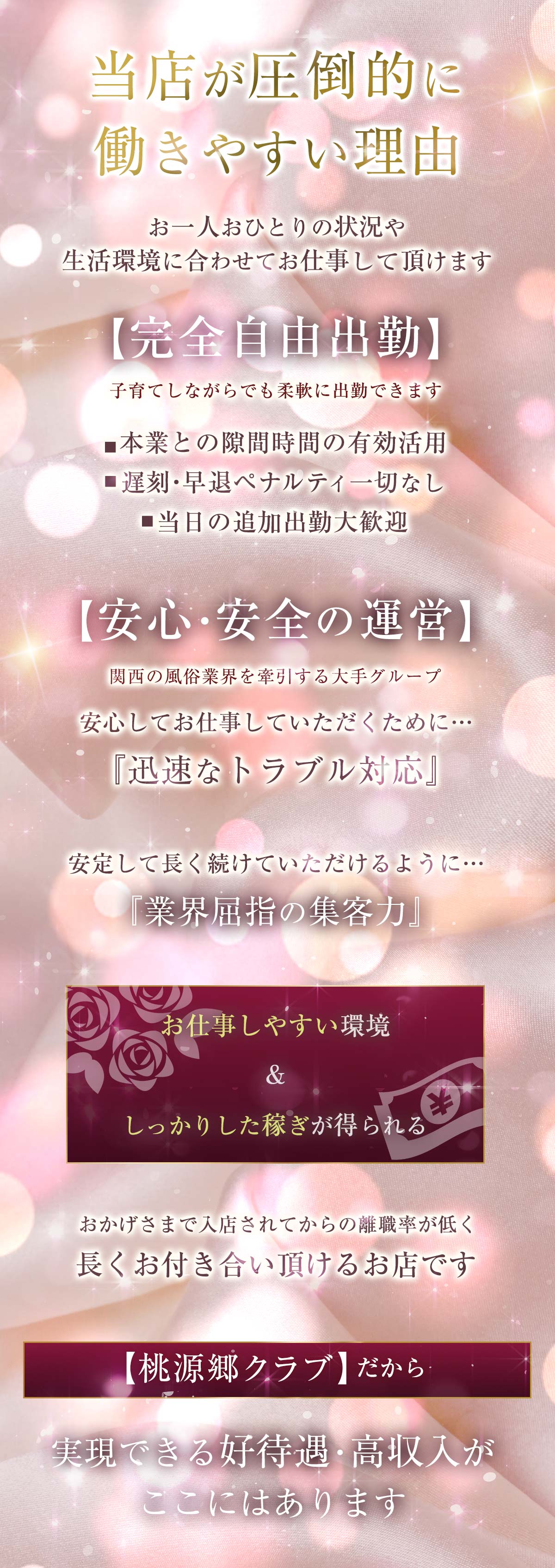 身バレ対策もでき安心・安全に働けるのが桃源郷クラブです...