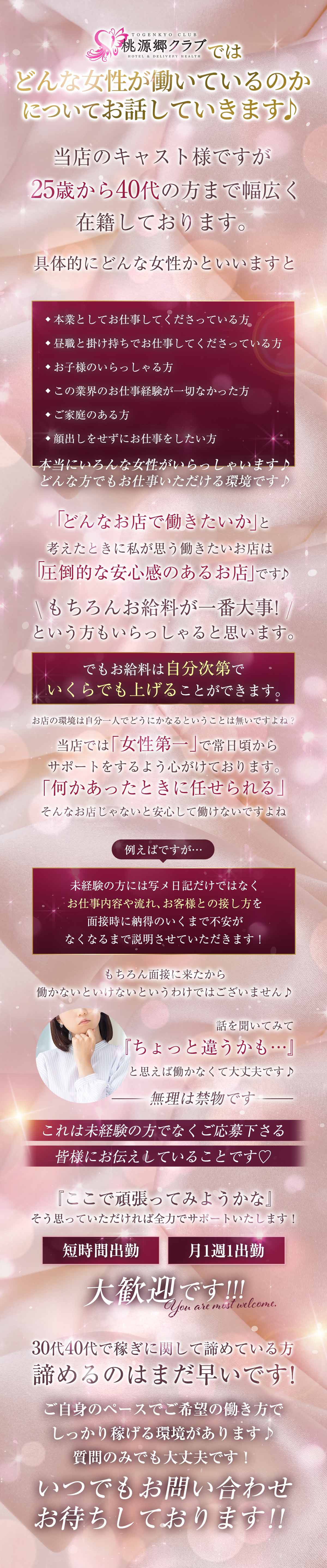 25歳以上の女性が安心して稼げるお店の代名詞『桃源郷クラブ』の面接担当のももキューと申します。