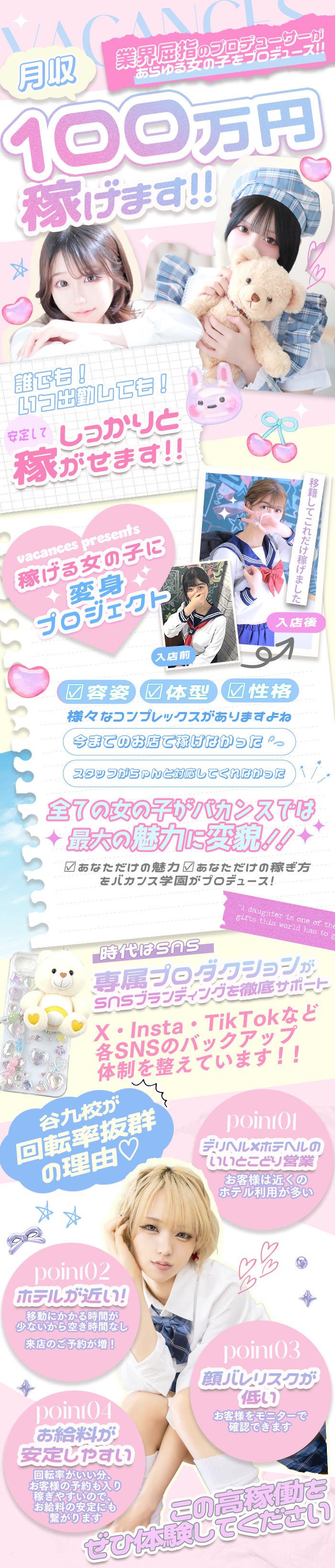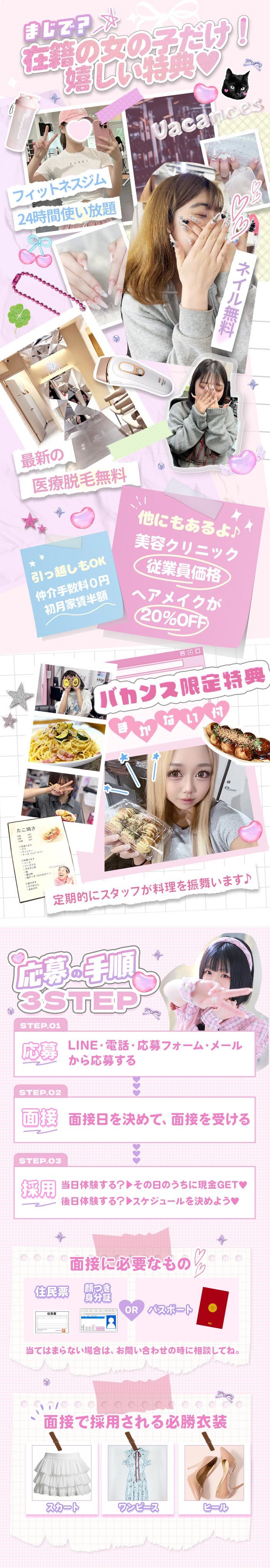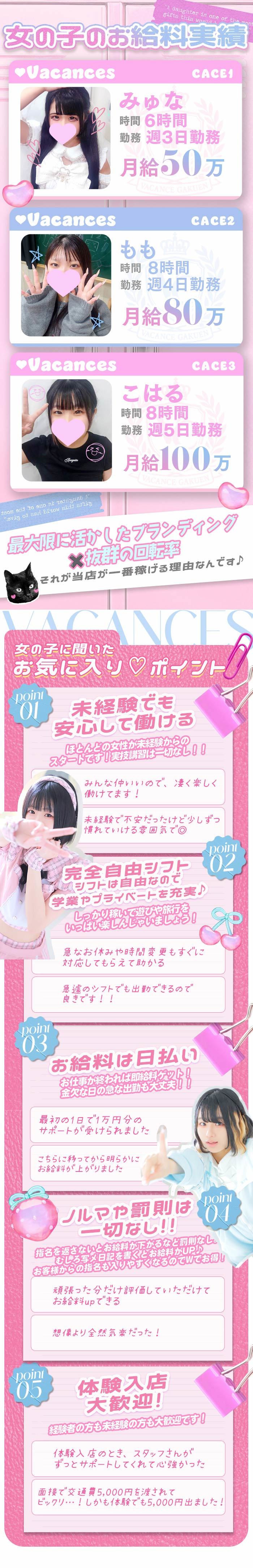 【どうしてこんなに稼げるの?】 01 大手グループだからこその知名度の高さ 02 在籍キャストの努力 03 店長&スタッフの接客力 04 ホテヘルとしても稼働しているからこその回転率 05 バカンスの誇る宣伝力 お店や女の子の宣伝に力を入れているから、安定して稼げるんです!💰✨ 【良いところ】 ✔CHECK*01 ~安定して稼げる環境~ お客様価格がお手頃だから、集客は抜群!💫 フリーのお客様は公平に振り分け! 「稼げない」なんて日はナシ!🙅🏻♀️ ✔CHECK*02 ~確実に稼げる環境~ ショートコースのお客様が多くて回転率もヨシ👍🏻🤍 スタッフがあなたの目標金額をしっかり後押し! あっという間に目標金額を達成!🌟 ✔CHECK*03 ~楽しく働ける環境~ 業界に対してマイナスイメージがある女の子もいるかも🥲💭 でもバカンスでは、「和気あいあい」「アットホーム」が文字通りのお店! 集団待機が苦手な人には個室待機もございます!! 制服などコスプレ気分を堪能🎀 ✔CHECK*04 ~嬉しい設備~ 〇個室待機室 〇個別ロッカー 〇分煙室 〇ウォーターサーバー 〇お菓子BOX 〇お仕事備品一式 〇アイロン・コテ 〇無料Wi-Fi環境 設備を整えているので過ごしやすい ✔CHECK*05 ~福利厚生が充実~ 〇ジムが24時間使い放題💪🏻 〇美容クリニックが従業員価格!💅🏻💎 など、嬉しい特典が満載です |
