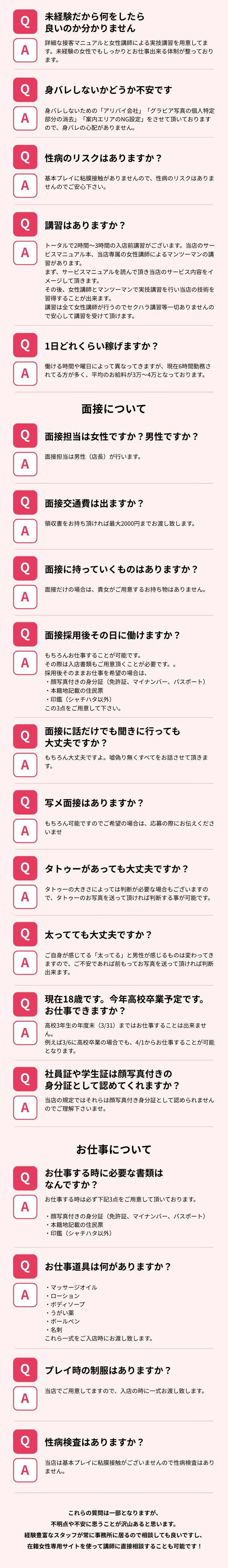 A | 性感エステのお店ですので、基本プレイ内容はソフトサービスのみです! ハンドフィニッシュまでですので、フェラなど病気になる可能性のあるサービスはありません。 |