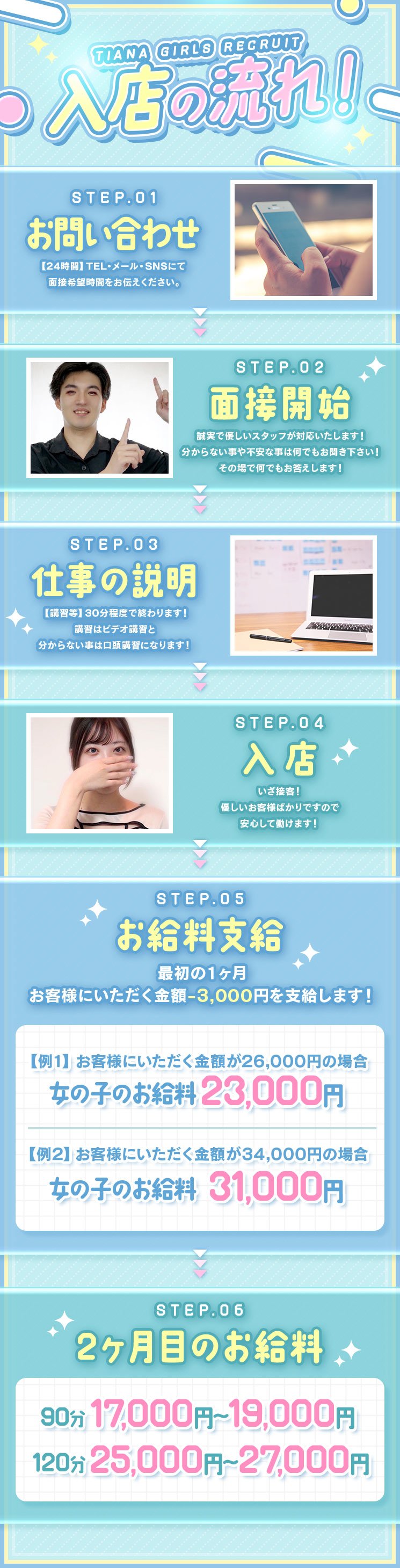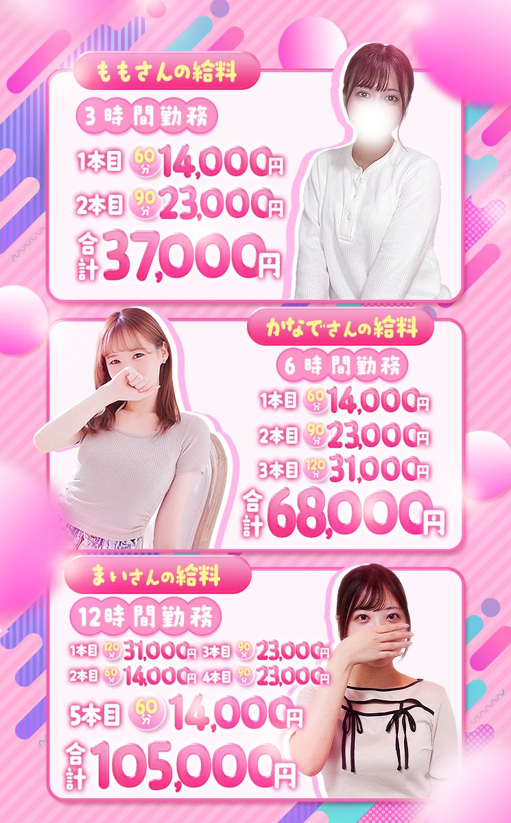 A | 最初の1ヶ月はコース料金から3000円しか頂きません🫣 1ヶ月後でも90分19000円バックも可能です🌸 |