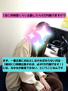 もしかしたら、1日に3~4人くらいのお客様に対応できて、出勤時間が8時間~10時間くらいで、4万円という目標が見えてくるかもしれません。