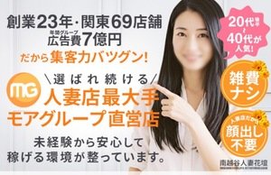 創業23年の人妻店大手グループ「モアグループ」だから、稼げるノウハウはNo.1クラス!関東69店舗、会員数30万人、グループ広告費年間7億円以上!