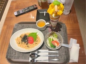 明太子パスタにサラダ、スープにパフェまで揃ってて