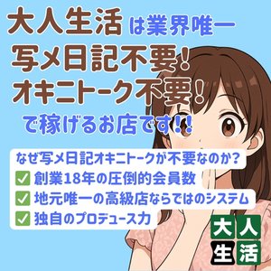 大人生活は、業界で唯一「写メ日記・オキニトークなし」でもしっかり稼げるノウハルのあるお店です!