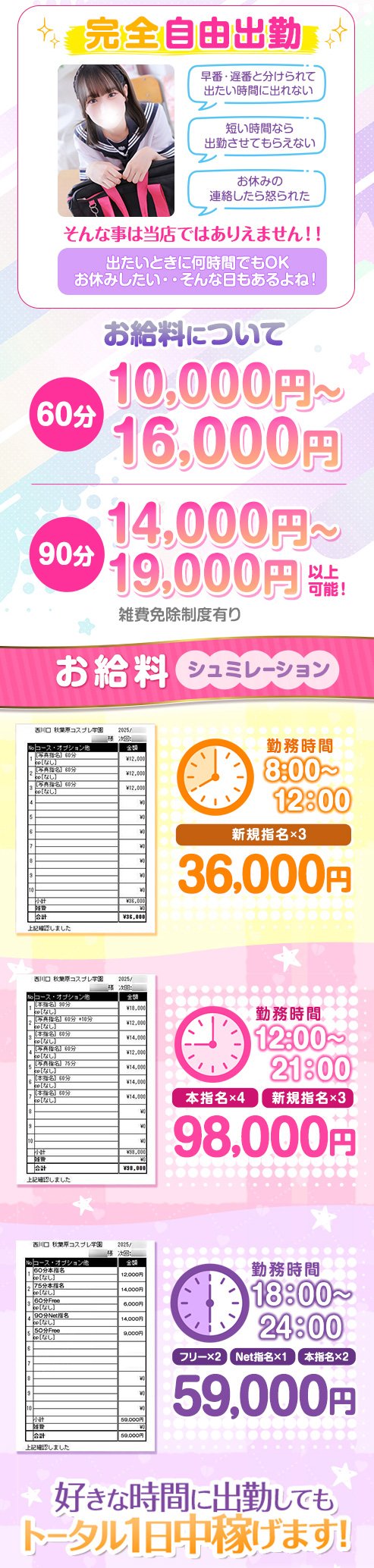 当店秋葉原コスプレ学園in西川口店は完全自由出勤制!あなたのライフスタイルに合わせて出勤時間も退勤時間も出勤日数も決められます♪いきなりのお休みになった、暇な時間が出来たその日に急遽!!など大歓迎です♪月に1日だけ、なんていう女の子もいますよ(*´ω`*)