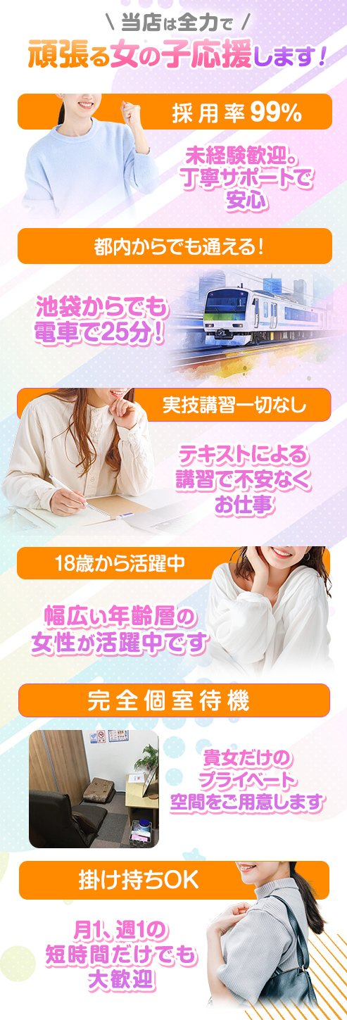 お店の9割の女の子が未経験からのスタートなので、何もわからなくても全然大丈夫!安心してお越しくださいね♪