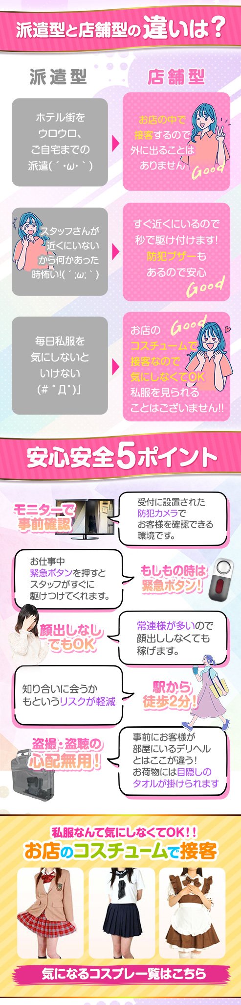 デリヘルと違い、スタッフがお店に常駐。なので万が一のトラブルでも安心ですね♪