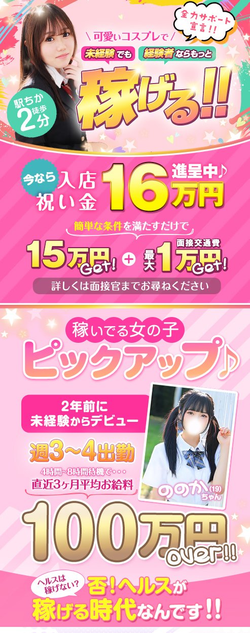 | A | 他のお店さんでは、顔出しできないと稼ぎにくいお店さんもあるかと思いますが、秋コスグループは顔出しできない子が多くお客様もそれに慣れているので顔出しが全くできなくても稼げるお店なんです💖 実際在籍女性の中にはお顔を全く出していない女性も多数おります♪気になる方はぜひ営業ページもご確認ください('◇')ゞ |