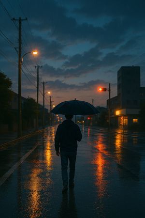 雨が弱まってきて、街の灯りがぽつぽつ光り始める夕方。