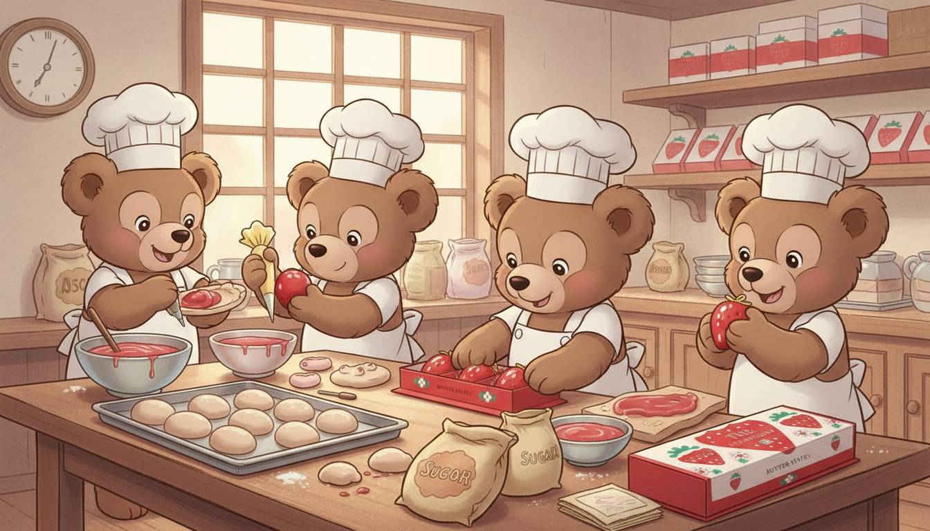 朝のやわらかい光が差し込むキッチンで、白いコック帽をかぶったくまさん達が大忙し🐻🍳✨