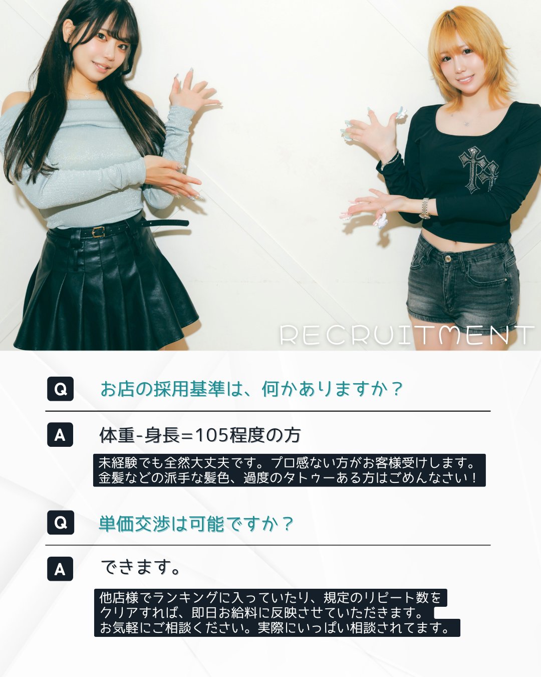 | A | A.可能です! まずは実際に働いてみて 当店の稼ぎやすさ、 居心地の良さを確かめてみてください。 現在、他店様で 活躍中の方の応募も大歓迎です。 |