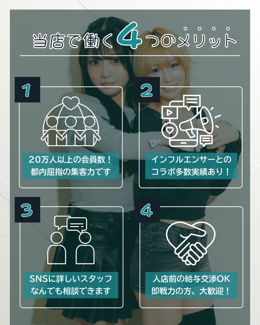 以前は同じ池袋で別のお店に在籍してましたがお店が変わるとこんなに違うのかと何から何まで違いました笑なによりスタッフさんが親身になって一緒に頑張ってくれるのと色んな事を提案してくれるし、逆に色んな提案を否定せず乗ってくれるので働き甲斐があります。未経験の子も多くて経験者・未経験者どちらも環境的に凄い働きやすいお店ですね。