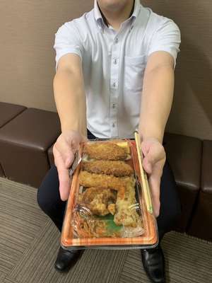 事務所に戻ってきたスタッフの手に握られているのは当店で人気の『オリジン弁当』