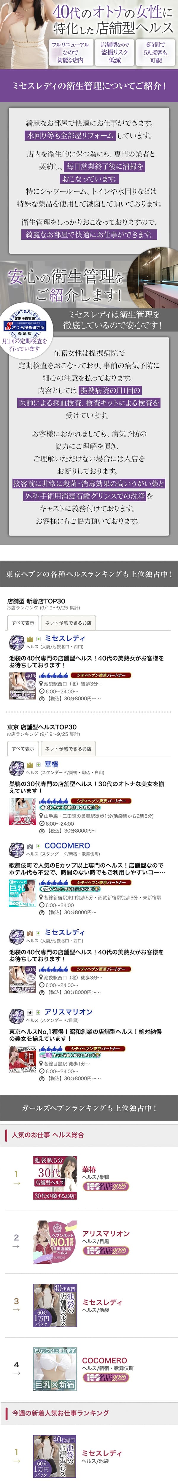 池袋の40代専門の店舗型ヘルスのミセスレディは、完全店舗型なので移動もなく接客効率も良いので稼ぎやすいです!6時間で5人接客も可能です!60分バックは10,000円~16,000円です!同業種の店舗型ヘルスでなければデリヘル、ホテヘル等との掛け持ちも大歓迎!朝6時~24時までオールタイムで稼げます!