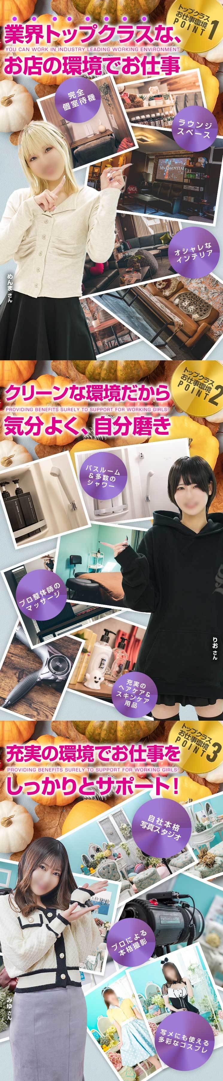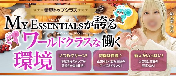 | A | 「笑顔」を一番大切にしているところです! 性的サービスを最重要視せず、アナタの気配りや笑顔を一番に評価します! ・フリードリンク・フリーフード ・キレイな待機環境 ・バーベキューなどの定期イベント などなど 全ては笑顔で仕事をしていただくためのサポートです! 笑顔を絶やさない心温まるデリヘル店。それがMyEssentialsです! |