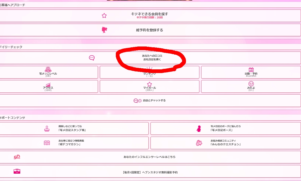 姫デコの中に赤丸で囲んだ『あなたへの口コミお礼日記を書く』をタッチすれば、