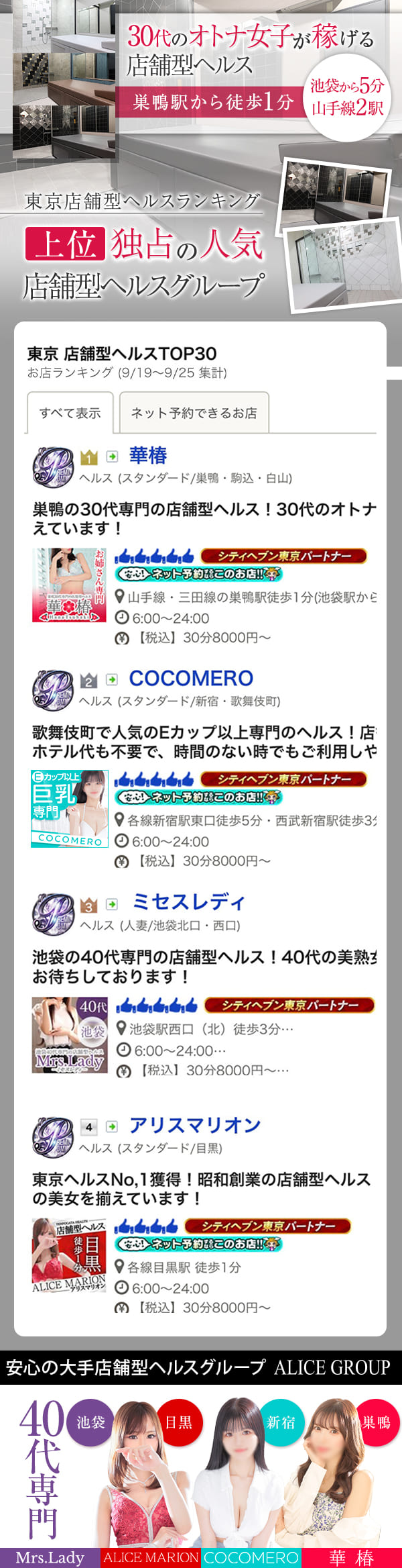 30代専門の店舗型ヘルス華椿(ハナツバキ)池袋駅から5分で巣鴨駅に到着!完全店舗型なので移動もなく接客効率も良いので短時間でも稼ぎやすいです!当店は30代がコンセプトですので容姿、系統も問いません!6時間で5人接客も可能!朝6時~24時までオールタイムで稼げて60分10000円の最低保証もあります!