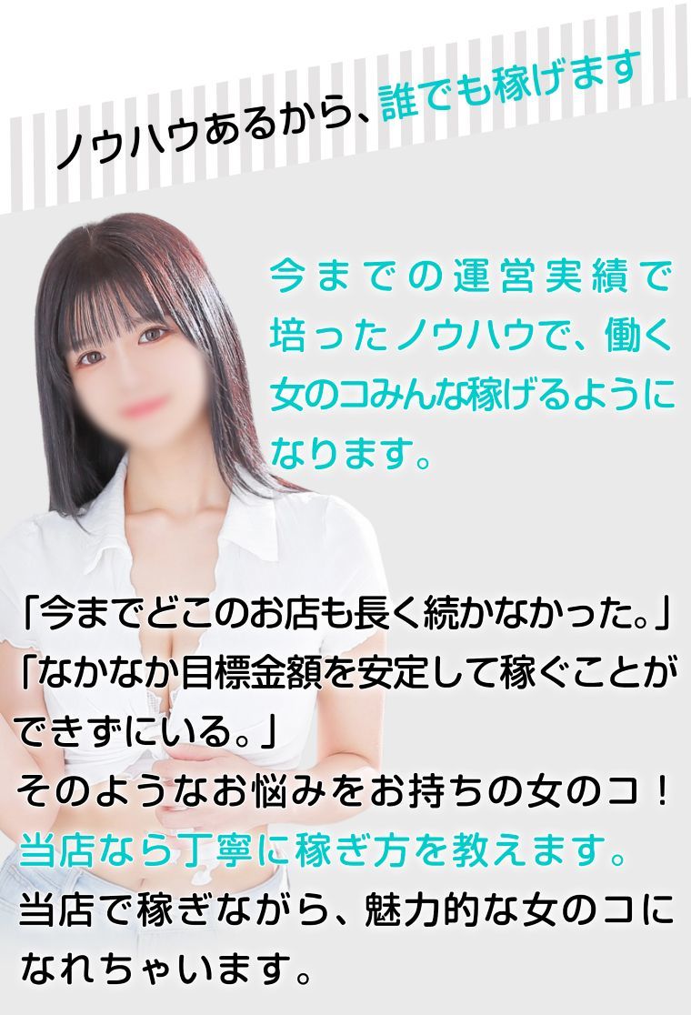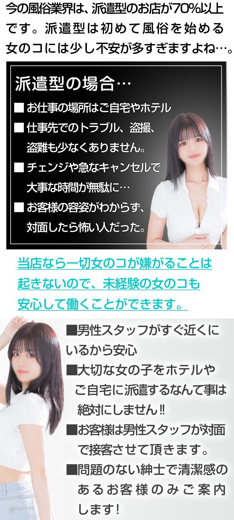 ・当店はバストEカップ以上の巨乳専門店なのでEカップ以上であれば多くは求めていませんのでご安心ください。バストに特化したお店ですので現在スタンダードなお店で働いている方はバストを武器に効率良く稼いだ方が指名も取りやすく稼ぎやすいと思います。 ・当店は店舗型なのでデリヘル(派遣型)のようにホテルや自宅への移動が無いため時間ロスが少ないので同じ時間働いても回転率が良いので日給に換算するとデリヘルより稼げる場合が多いです。日給5万円以上の女性は毎日多数います。女性バックは最低60分10000円~12000円スタートになります。また入店して指名の数が多いとバックアップしますので8時間で10万円以上稼ぐ女性もいます。最近はメンズエステ(メンエス)からの移籍の方も増えています。 ・デリヘルからの移籍女性からよく聞く悩みとして○○強要や盗撮などをお聞きしますが、当店は店舗型なので店内のお部屋で接客する為スタッフが近くに常駐し部屋の管理も行ってますのでご安心ください。セクキャバやピンサロから移籍された女性からはシャワーがあって衛生的で安心ともお聞きします。 ・衛生管理の部分では女性キャストには毎月、性病検査を提携医療機関のさくら検査研究所様でおこなっていますので店内での性病の感染を抑止しております。 ・お客様層が良いと働く女性からよく聞きます。理由としてハードサービスが売りのお店ではない、お客様のルール違反は迅速に出入り禁止の対応、来店時に相応しくないと判断したお客様はお断り、お客様ご案内前に禁止事項の確認など、多数のお客様管理を行っています。 ・未経験の女性でも男性スタッフ実技講習はありませんのでご安心下さい。仕事の仕方は講習DVD、女性講習員かのいずれかで選択できます。経験者は講習はありません。 ・男性スタッフの教育もおこなってります。全員スーツ、ネクタイ着用で身なり言葉使いに気を配っております。 ・風俗の仕事をするにあたって知人バレが気になるかと思いますが当店は店舗型なので一度お店に来てしまえばデリヘルやホテヘルのようにホテルや自宅への移動も無いのでバレる確率は断然低いですのでご安心下さい。 ・巨乳店なので多少ぽっちゃり、ぽちゃを気にしている方も面接にお越し下さい。オールジャンルの目黒アリスマリオン、30代専門の巣鴨の華椿、40代専門の池袋のミセスレディもあります。全店舗、内装も高級店ぐらい綺麗で募集年齢は20代30代40代と幅広く採用しており顔出ししなくても稼げて最低保証もあります。また面接にお越し頂いた方全員に面接交通費をお渡ししています。最低保証もあります。 |