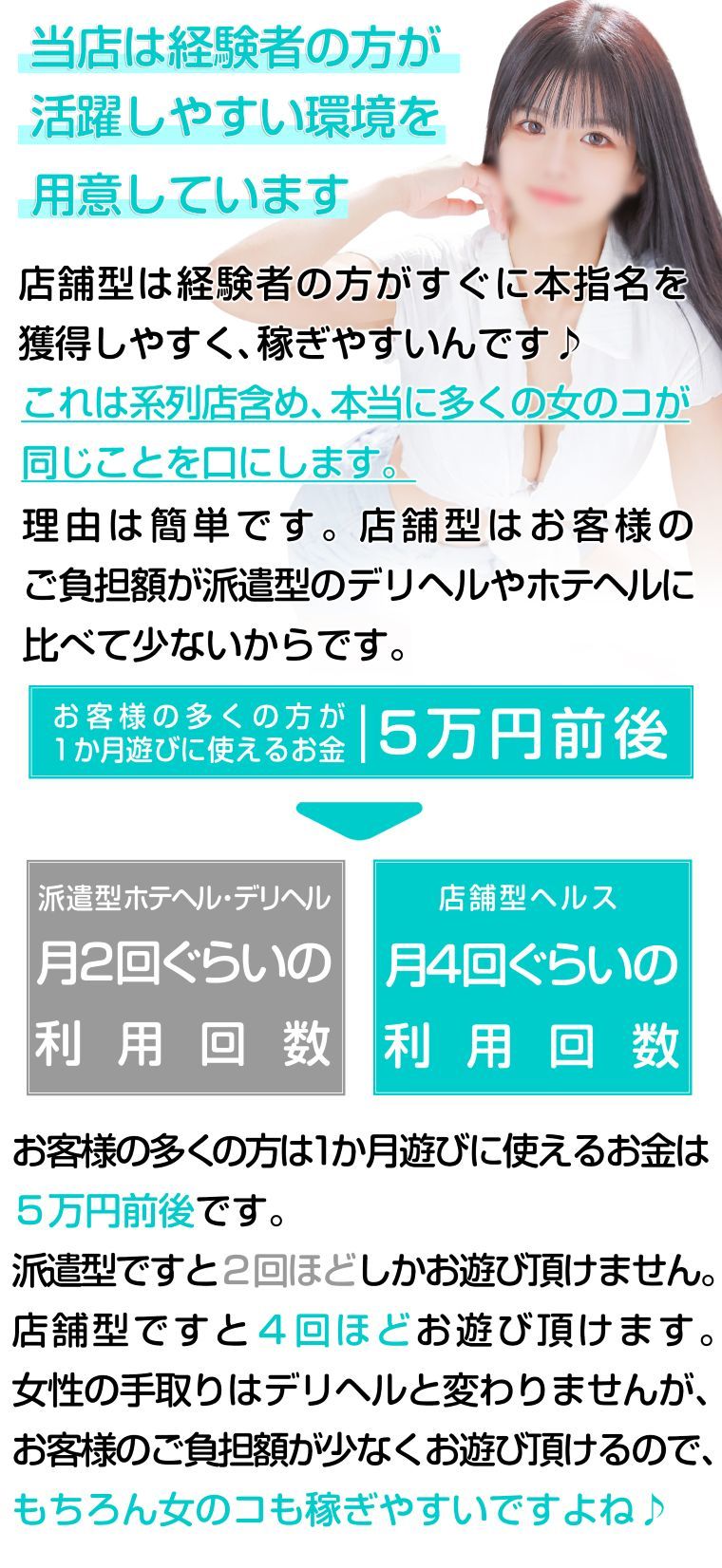 A他業種と比べて女性の手取りは変わりませんがお客様のお支払い料金が違います。当店60分17000円+指名2000円=19000円ですがデリヘルの場合、別に交通費1000円~3000円、ホテル代3000円~7000円です。当店は店舗型ヘルスなのでお部屋代は含まれます。最大で10000円お客様もお支払いが安くなるので経済的負担も少ないので利用しやすいです。