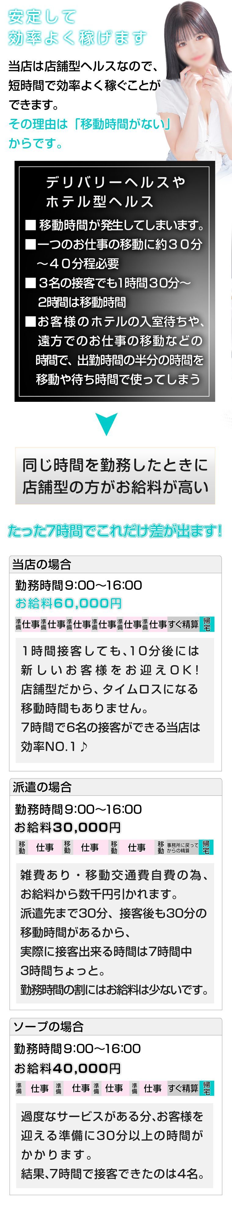 A当店の在籍女性の半分はデリヘル、ホテヘルからの移籍になりますが前より稼げるとお聞きします。一つは車や徒歩での移動がない為、効率が良く同じ時間出勤しても接客できる人数が違ってきます。6時間で6人の接客も可能です。ピンサロから移籍される女性もいますが前より衛生的で稼げているとお聞きします。