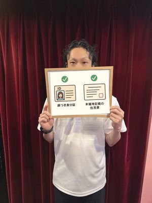 例:顔写真付きの身分証明書(運転免許証、パスポート、マイナンバーカード、住民基本台帳カード)と入店までに本籍地入りの住民票が必要になります。