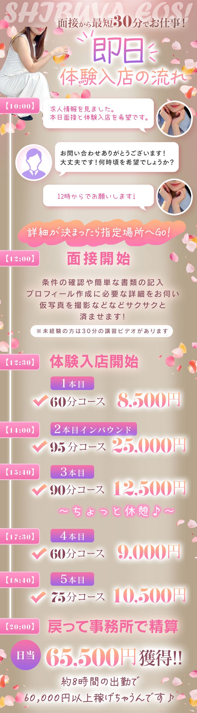 A | 渋谷エオスでは、面接から最短30分で体験入店が可能です! お急ぎの方は、その日のうちにお仕事スタートもできます。 一方で「しっかり説明を聞いてから決めたい」という方には、ゆっくり丁寧にご案内しますので、約1時間程度で進行しています。 無理に急がせることはなく、不安や疑問を解消した上でスタートできるので安心です。 |