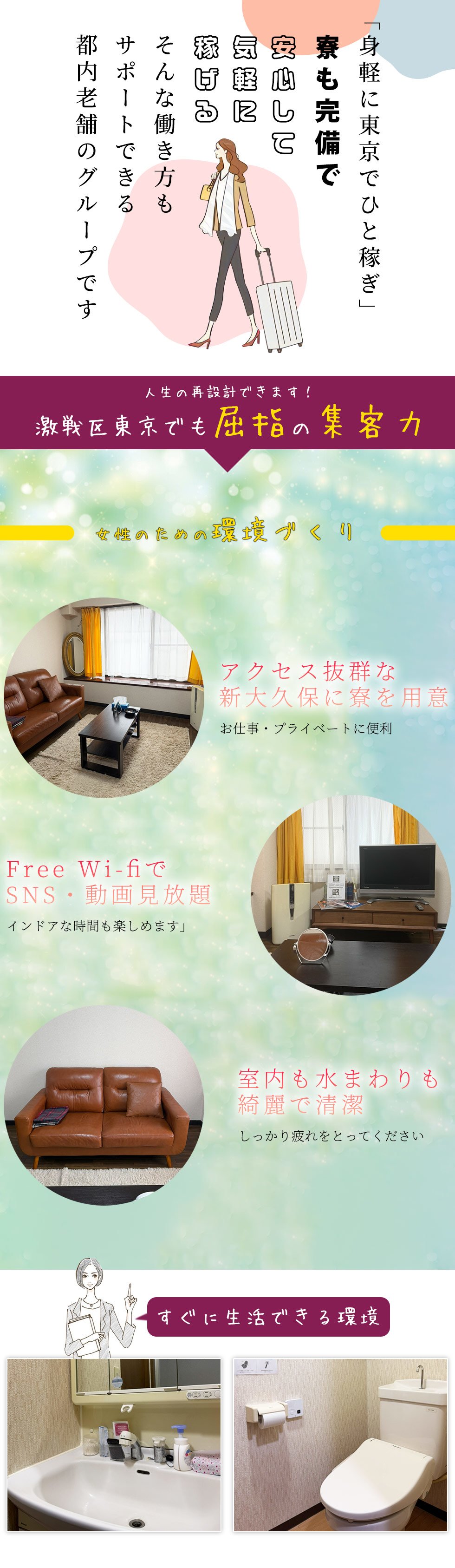 | A | 恵比寿に綺麗な待機場所を用意していますカフェエリア・仮眠エリア 個室エリアなどをご用意しております。 また、五反田などの駅近くにも待機場所がございます。 主要駅付近での外待機も可能となっております。 |