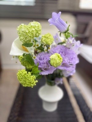 こんにちは、スミレです♡今週のお花は春っぽい淡いカラーに♡カンパニュラという釣り鐘形が特徴のお花がポイントです✨️