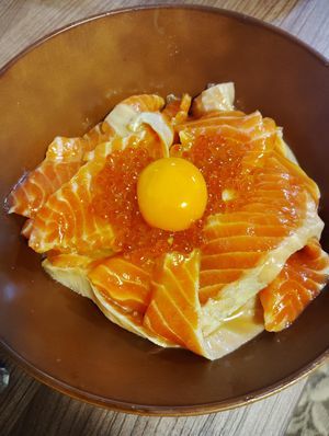 イクラ・サーモン・卵黄を贅沢に乗せた海鮮丼。