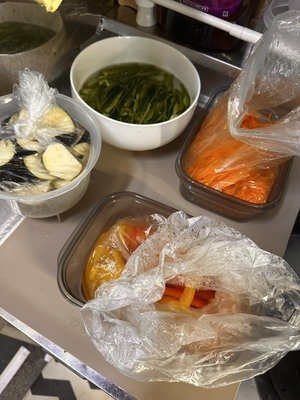 ピーマンは縦に千切りに、にんじんはスティック、なすはざく切り。冷蔵・冷凍を分けてストック完了👍