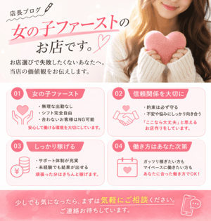 女の子を最優先に考え、信頼関係を大切にしながら、しっかり稼げて自由に働けるお店が当店です